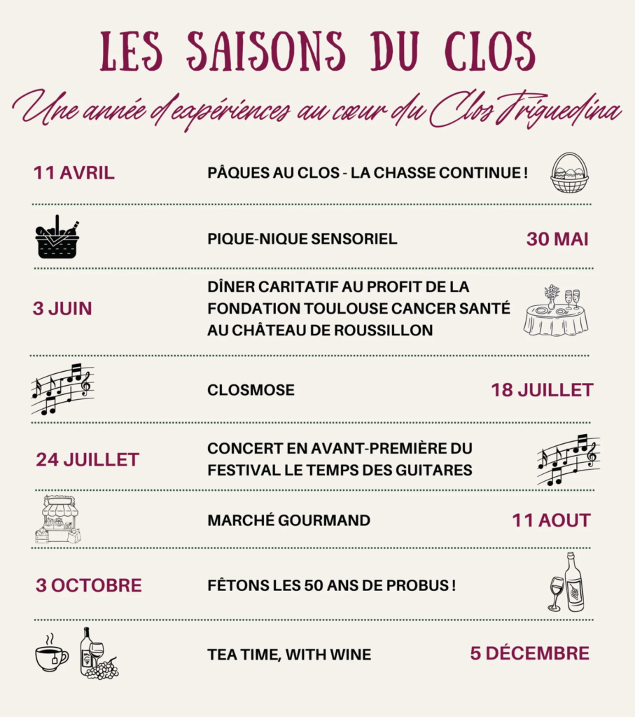 Au Pavillon du Clos Triguedina, nous recevons comme chez nous. Visites guidées, ateliers, dégustations privées, balades à vélo, accords mets & vins… chaque expérience est un moment sincère, conçu pour vous faire ressentir notre terroir de l’intérieur.